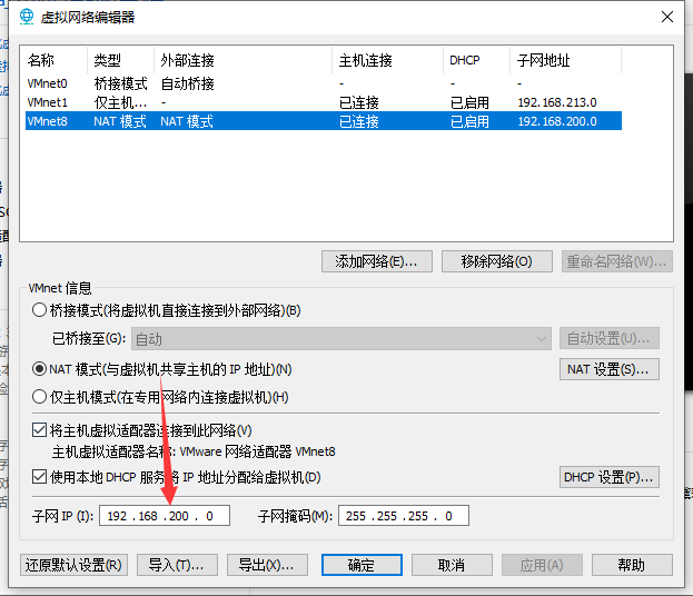 打开后,按要求,设置虚拟机vm8net子网ip地址为 192.168.200.0