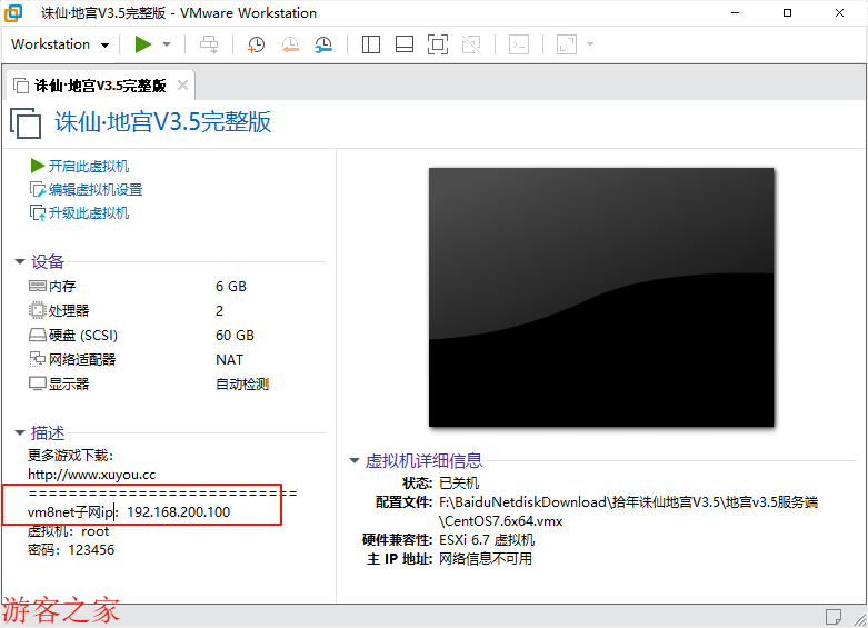这款游戏的服务端是装载了虚拟机系统里了,linux系统服务端配置配置也比较麻烦,做好的镜像安装好虚拟机后直接打开就可以了。