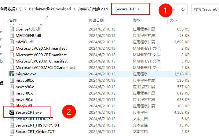 接下来使用链接软件启动游戏服务。先进入 SecureCRT 这个文件夹,打开 SecureCRT.exe