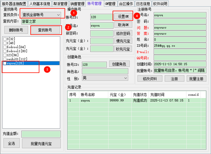 设置GM账号:按照标记操作。设置GM账号看,玩游戏方便查看id等操作