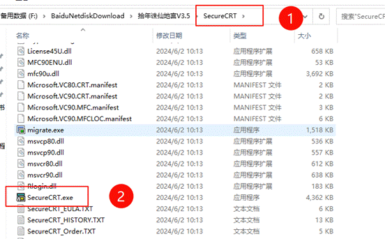 接下来使用链接软件启动游戏服务。先进入 SecureCRT 这个文件夹,打开 SecureCRT.exe