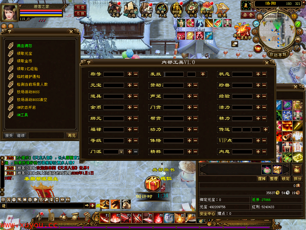 这个版本的也有内部GM工具。可以在游戏中很方便的修改各种东西发物品什么的现改现用,现发现用。对GM账号有用。
